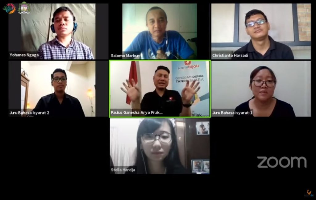 Pada sesi pertama, Yohanes Ngaga yang biasa disapa Anis membagikan pengalamannya selama pandemi. Mahasiswa Uninus Bandung ini bercerita selama pandemi dia aktif menulis di blog pribadinya yang terinspirasi dari pengalaman hidupnya sehari-hari. Sementara itu, Paulus Ganesha berkisah tentang KamiBijak (Kami Berbahasa Isyarat Jakarta), sebuah laman internet yang memberi kemudahan akses informasi daring ramah disabilitas terutama bagi mereka yang keterbatasan pendengaran (Tuli) melalui media visual dalam bentuk video Bahasa Isyarat dan Teks.