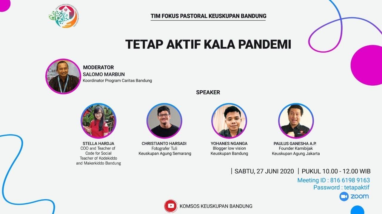 Itulah pernyataan penutup dari Stella Hardja, yang mengutip dari rekan disabilitas Aria Pratama, yang menjadi salah satu narasumber dalam webinar Tim Fokus Pastoral Keuskupan Bandung, dengan tema Tetap Aktif Kala Pandemi. Acara yang diselenggarakan pada tanggal 27 Juni 2020 ini dimoderatori oleh Salomo Marbun, Koordinator Program Caritas Bandung, memanfaatkan platform Zoom.