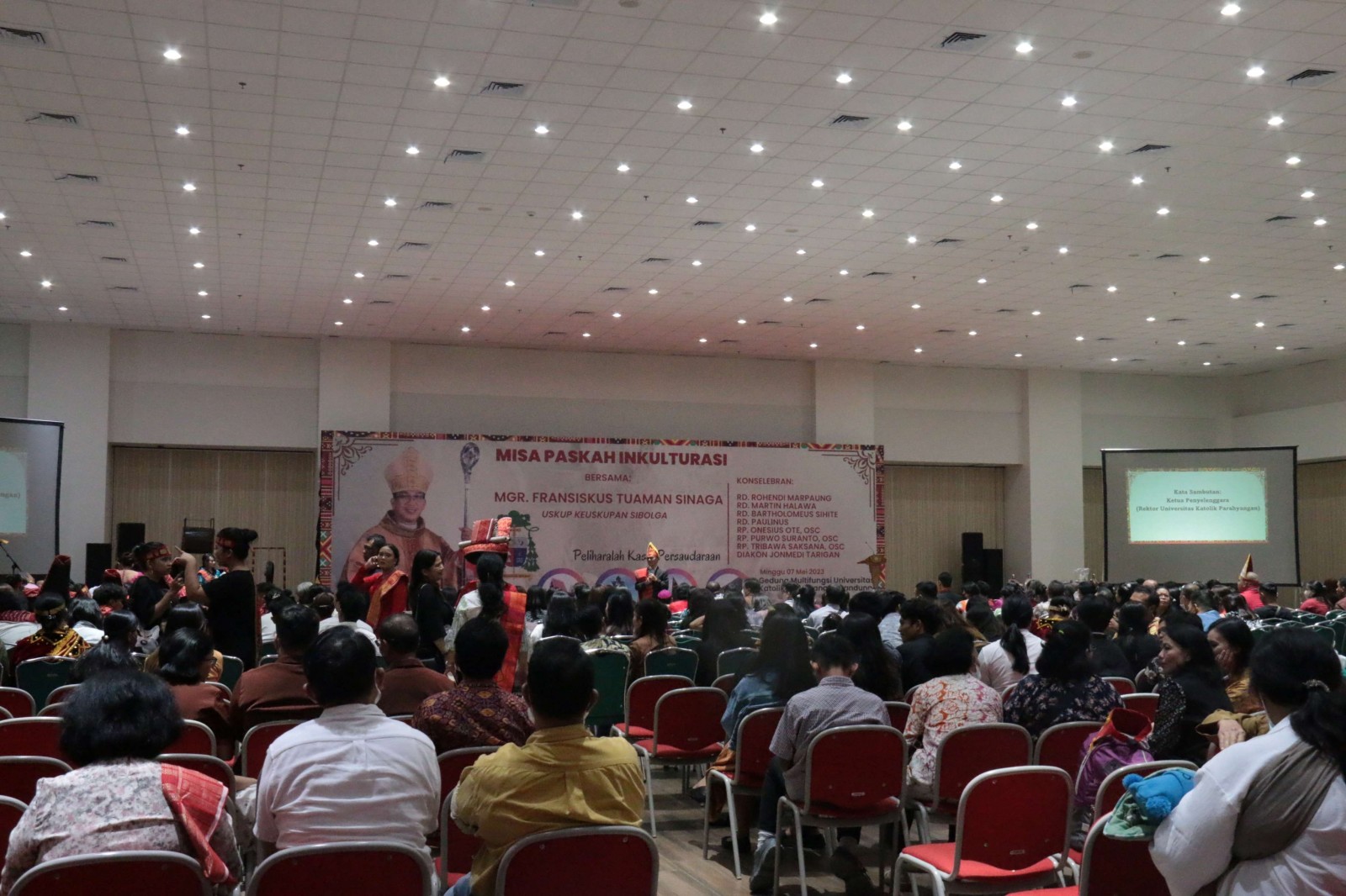 Itulah sapaan hangat dari Mgr. Fransiskus Tuaman Sinaga, Uskup Keuskupan Sibolga, kala menyambut para peserta Misa Paskah Inkulturasi (Minggu, 7/5/2023). Perayaan Misa Paskah dan acara ramah tamah ini diadakan di aula PPAG Universitas Katolik Parahyangan, Jl. Ciumbuleuit No.94, Hegarmanah, Kec. Cidadap, Bandung. Misa diikuti oleh umat yang sebagian besar berasal dari etnis Batak dan Nias. Misa Paskah Inkulturasi dimulai pada pukul 10.00 WIB, dan dipimpin langsung oleh Mgr. Fransiskus Tuaman didampingi oleh sejumlah Imam dan satu Diakon. Agar nuansa inkulturasi semakin terasa, Perayaan Ekaristi dihiasi juga dengan lagu-lagu khas daerah Batak dan Nias.