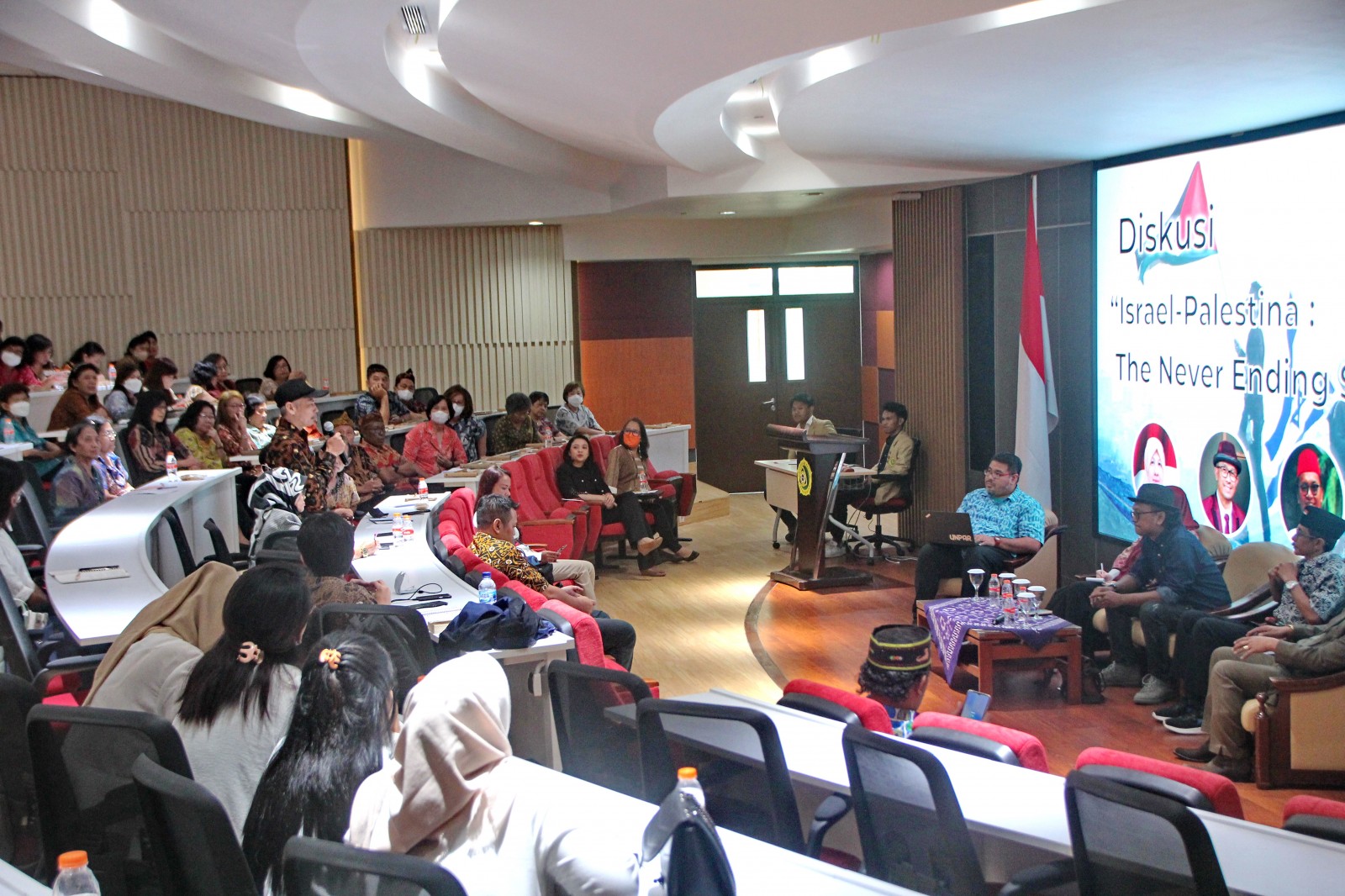 Diskusi dimulai dengan pemaparan latar belakang situasi dan sejarah pembagian wilayah di Palestina antara Israel dan Palestina oleh PBB yang tecatat dalam Hukum International yang dipaparkan secara mendetil oleh Dina Sulaeman Dosen Hubungan Internasional. Kemudian pelanggaran-pelanggaran yang terjadi baik pelanggaran hak kekuasaan tanah dan hak asasi manusia dijelaskan pula dalam kaitannya dengan hukum internasional dan politik internasional. Pro kontra dari dampak konflik 2 Negara ini yang terjadi di Indonesia mengerucut menjadi satu pemahaman bahwa konflik Israel -Palestina ini bukanlah konflik mengenai agama, melainkan soal kedaulatan negara, politik, kemanusiaan dan kemerdekaan.