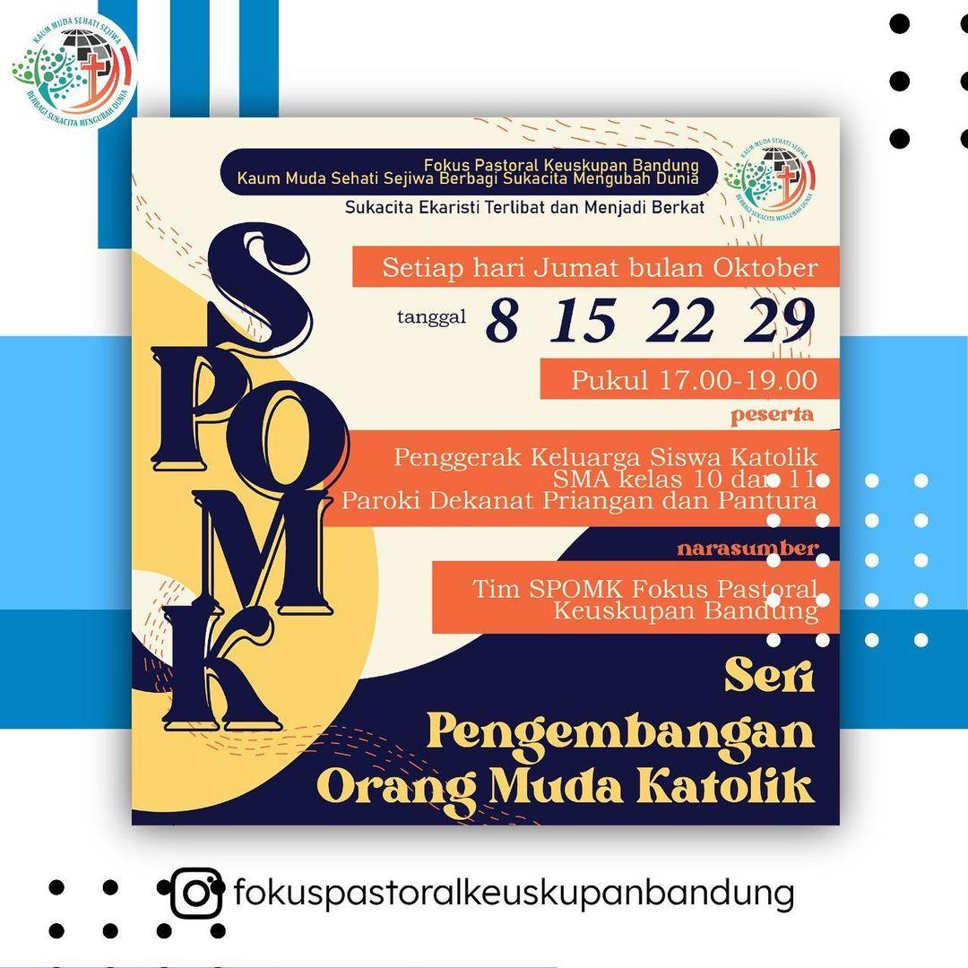 Mau ngingetin lagi nih, Fokus Pastoral Keuskupan Bandung mengajak seluruh orang muda, Penggerak KSK (Keluarga Siswa Katolik), Paroki dekanat priangan dan pantura. Untuk dapat mengikuti kegiatan Seri Pengembangan Orang Muda Katolik dengan narasumber Tim SPOMK Fokus Pastoral Keuskupan Bandung. ????