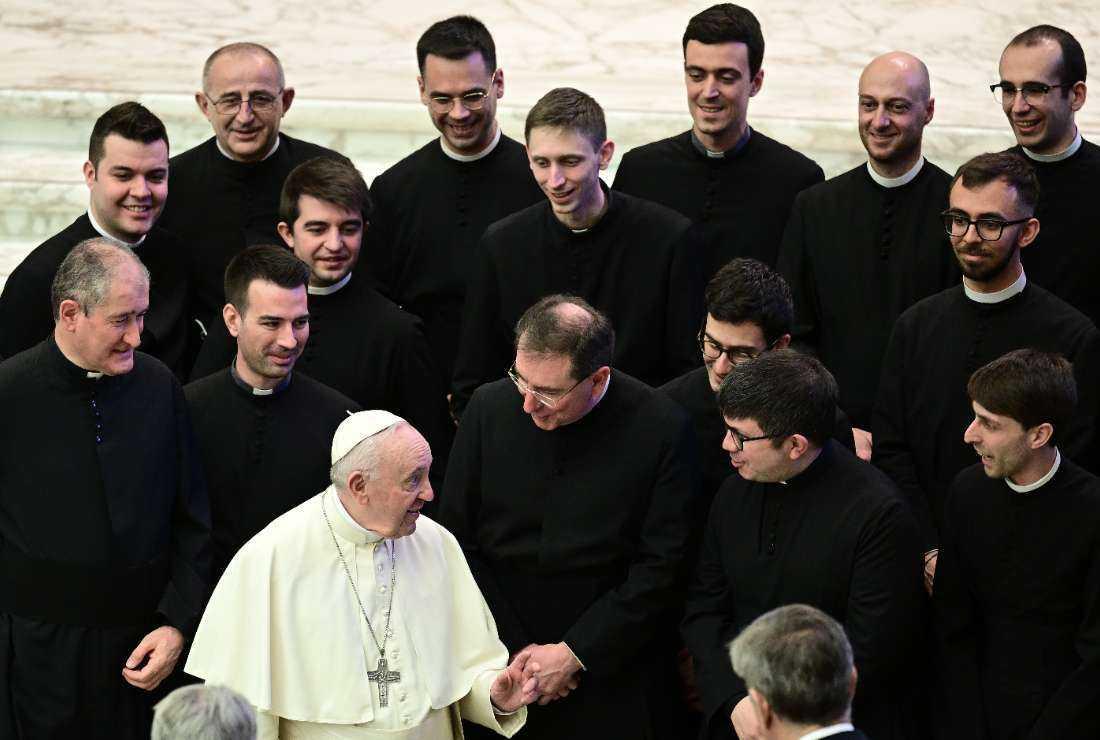 Paus Fransiskus bertemu dengan para imam selama audiensi umum mingguan pada 23 Maret 2022, di aula Paulus VI di Vatikan. (Foto: AFP)